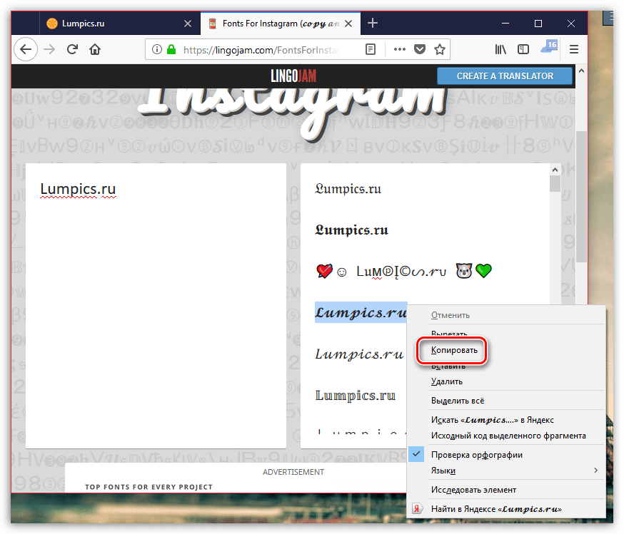 - ะะปั iPhone cะบะฐัะฐะนัะต ะธ ัััะฐะฝะพะฒะธัะต ะฑะตัะฟะปะฐัะฝะพะต ะฟัะธะปะพะถะตะฝะธะต Fonts & Text Emoji for Instagram ะธะท App Store. ะะปั Android ัะตะฐะปะธะทะพะฒะฐะฝะพ ะบัะฐะนะฝะต ะฟะพั ะพะถะตะต ะฟัะธะปะพะถะตะฝะธะต Font for Intagram โ Beauty Font Style, ะฟัะธะฝัะธะฟ ัะฐะฑะพัั ั ะบะพัะพััะผ ะฑัะดะตั ัะพัะฝะพ ัะฐะบะธะผ ะถะต.