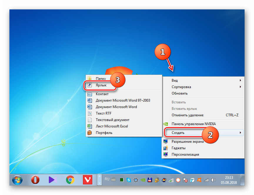 - Перейдите на «Рабочий стол» и щелкните по нему правой кнопкой мыши (ПКМ). В контекстном меню выберите «Создать» и в открывшемся дополнительном списке переместитесь по пункту «Ярлык».