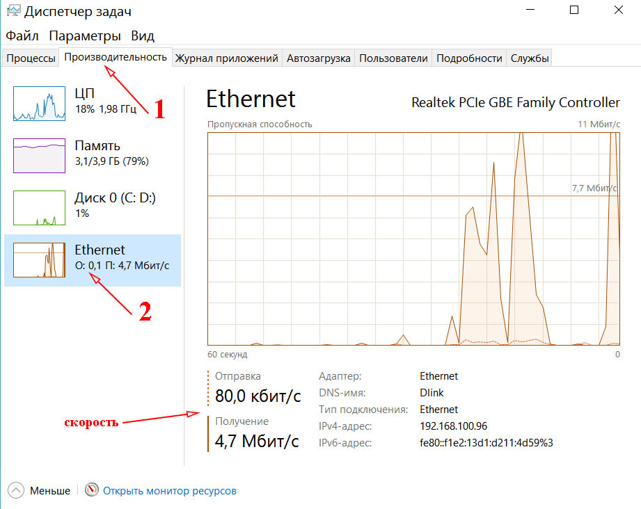 Имеющуюся быстроту вашего интернета легче всего глянуть в диспетчере задач нажав «Ctrl+Alt+Delete» в пункте «Производительность» найдете «Ethernet» или «WiFi», смотря чем вы пользуетесь. Далее запускаете ролик (к примеру в YouTube). На графике вы увидите, какая загруженность сети, так же показана скорость, он находится внизу, она будет плюс-минус соответствовать скорости подключения, заявленной вашим Internet провайдером. Это все в идеале, но бывает часто так, что реальная скорость занижена, тогда приходится все проверять, в первую очередь у себя, а потом звонить провайдеру.