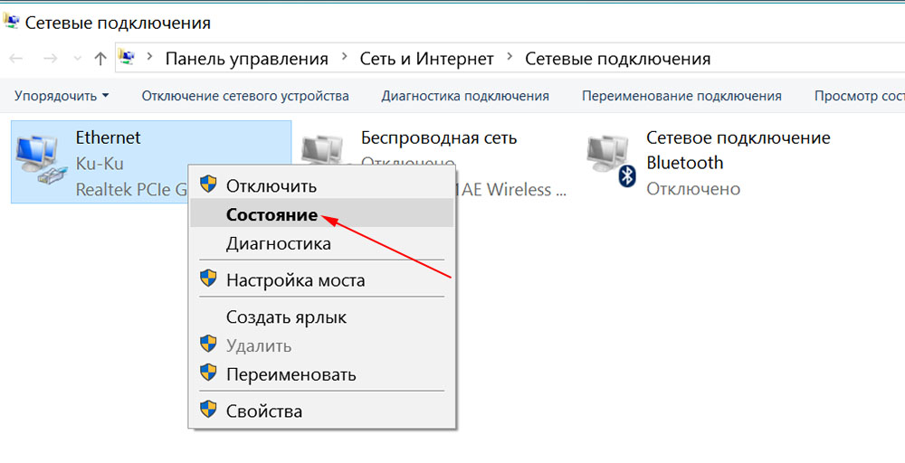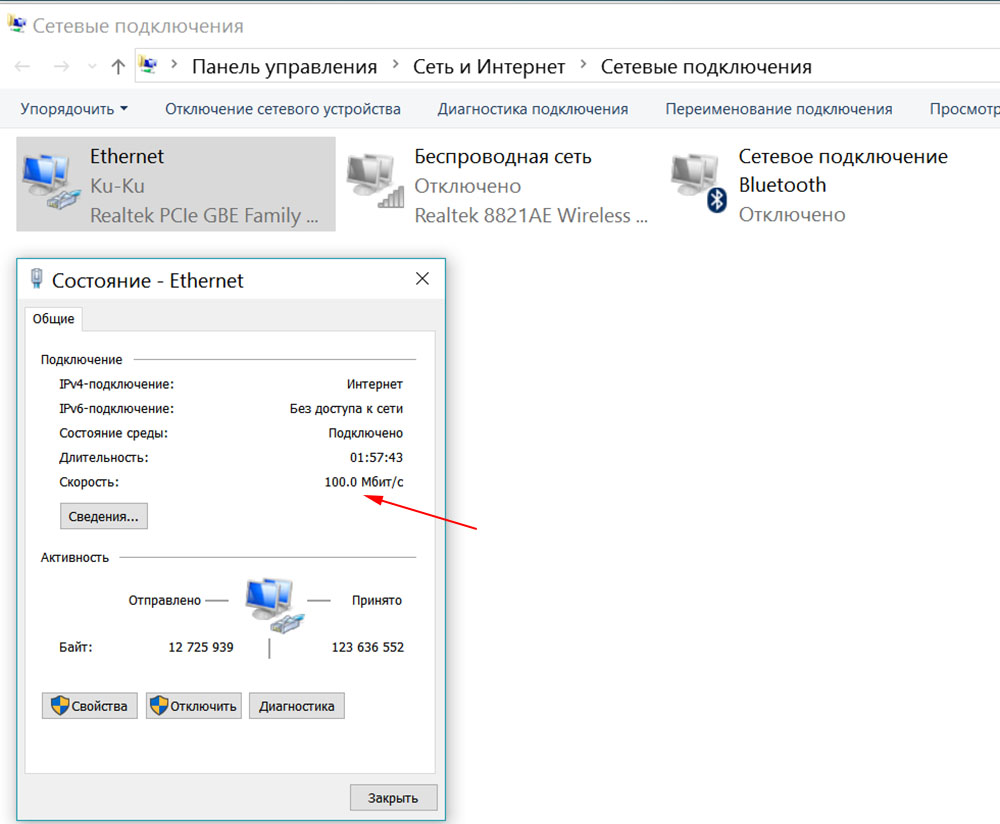 Чтобы выявить максимально допустимую быстроту Интернета в этом типе соединения, зайдите в папку «Сетевые подключения» и нажмите на раздел «Ethernet» правой кнопкой мыши, выбираем «Состояние». Необходимая нам информация находится в пункте «Общие». Показанная возможная скорость почти всегда в 2-3 раза меньше максимально возможной. И еще, разница при передаче данных по проводу и Wi fi может значительно отличаться.