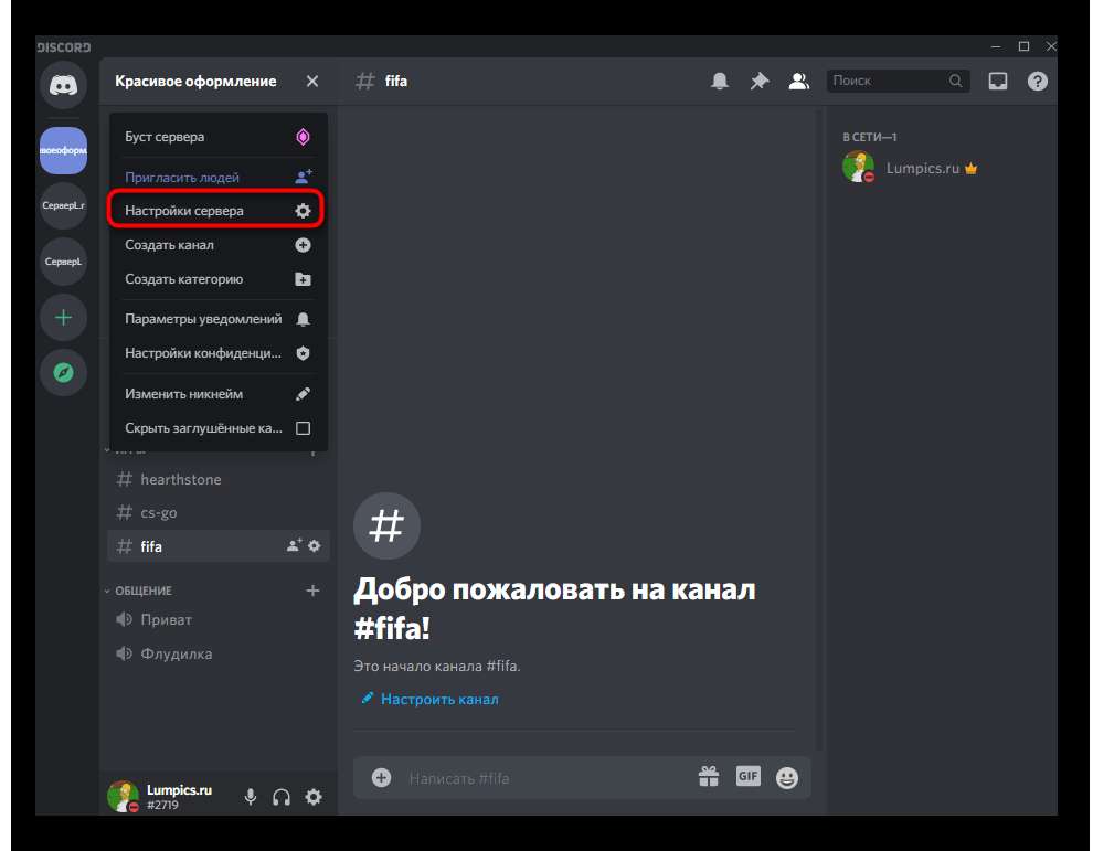 - Зайдите в настройки сервера.