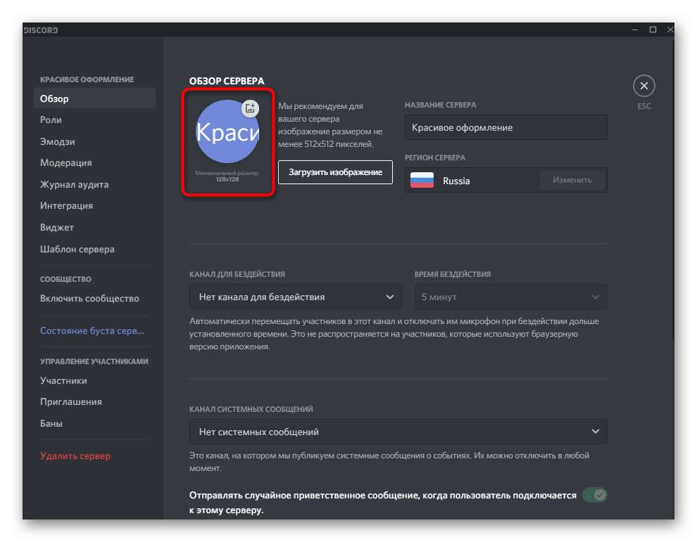 Отличный вариант, как оформить сервер в Дискорде – просто нажмите на кнопку «Загрузить» и закачайте подготовленные картинки. Сделать их нужно самостоятельно, можно найти и бесплатные варианты в сети по соответствующему запросу.