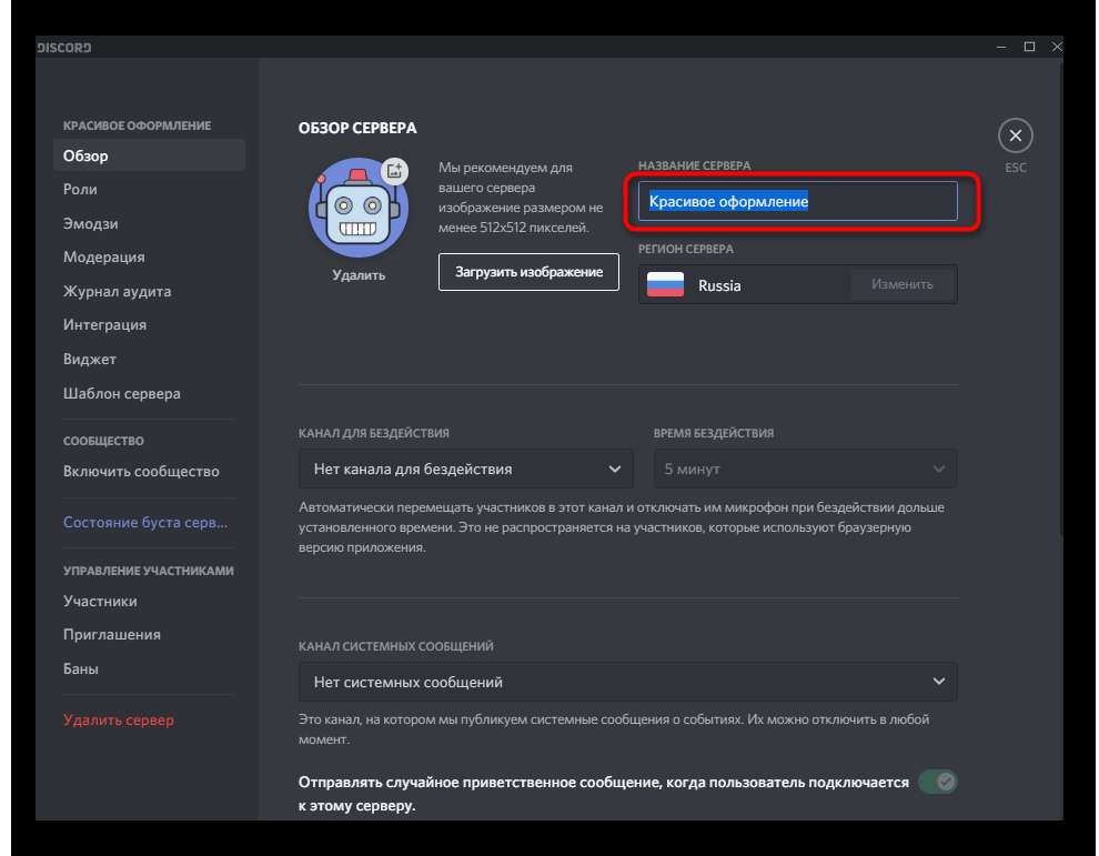 Еще одно полезное уточнение к тому, как красиво оформить сервер в Дискорде. Не спешите выходить из вкладки «Обзор». Найдите строку «Отправлять случайное приветственное сообщение…» и активируйте тумблер напротив. Это позволит подключить милые приветственные сообщения при добавлении новых участников. Очень здорово!