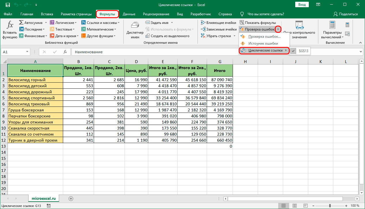 - На панели инструментов выберите вкладку «Формулы» и нажмите кнопку «Проверить циклические ссылки»;