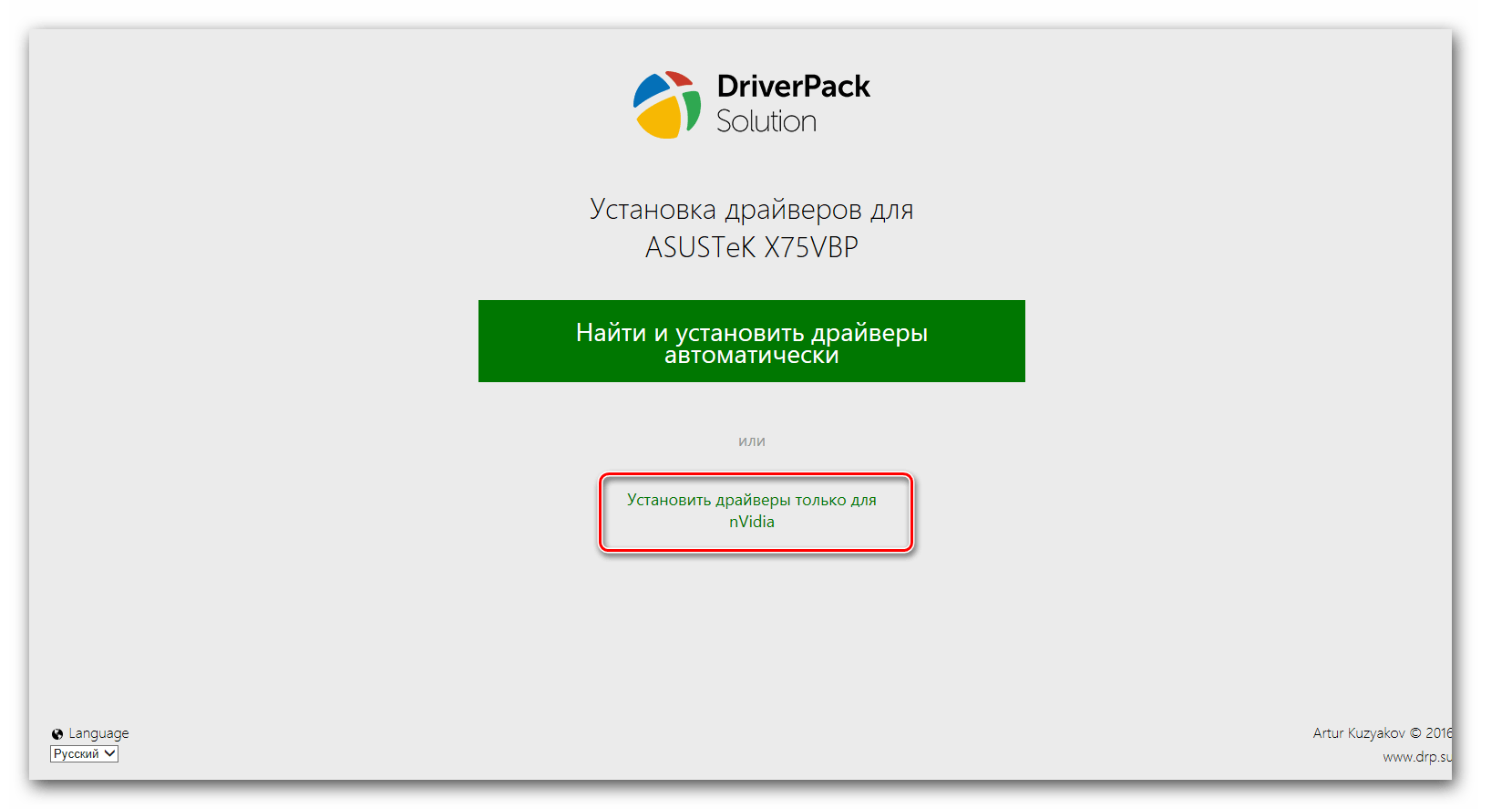 В появившемся окне мы увидим предложение об установке всех драйверов для компьютера в автоматическом режиме или для конкретного искомого устройства. Так как мы искали драйвера для конкретного оборудования, в данном случае видеокарты, то выбираем пункт «Установить драйверы только для nVidia».