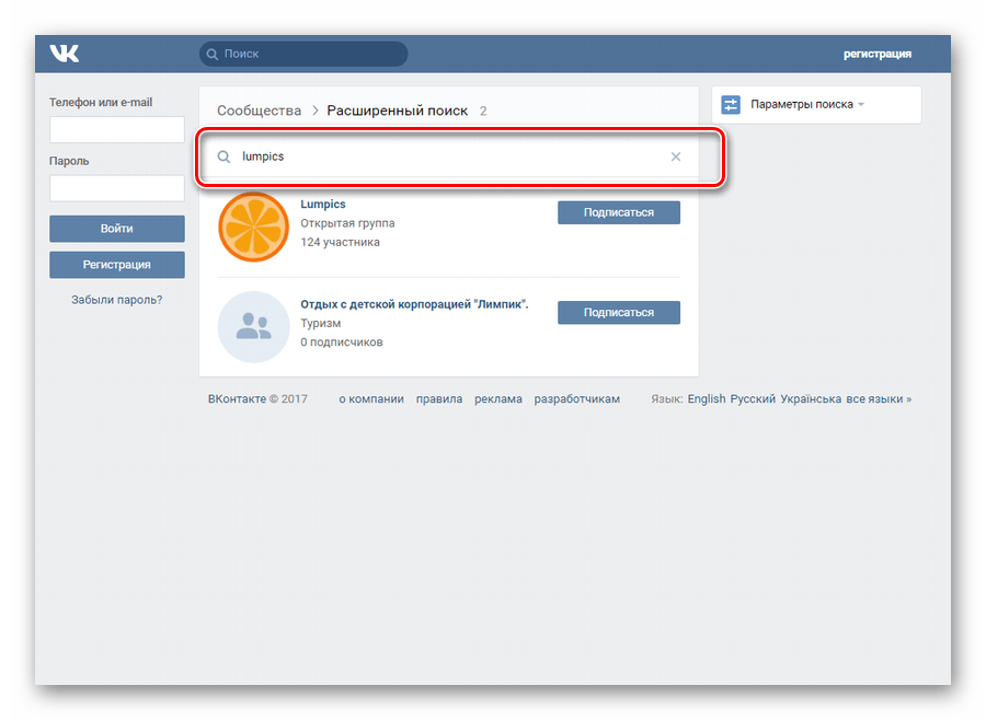 Способ 1: поиск сообществ без регистрации