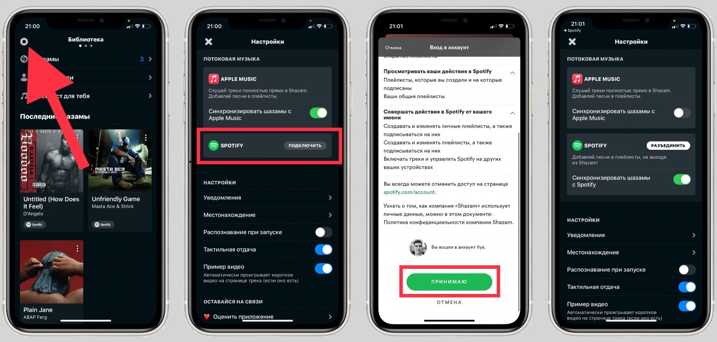 1. Откройте Shazam2. На вкладке Библиотека нажмите на иконку настроек в левом верхнем углу3. Нажмите кнопку Подключить рядом со Spotify (появится предупреждение, надо подтвердить действие)4. Отроется Spotify и окно с соглашением, нажмите кнопку Принимаю