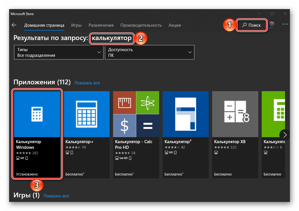 Если вы проверили и Пуск, и попробовали искать в указанной папке, и через поиск тоже не удалось ничего найти тогда, тогда, скорее всего ваш калькулятор был удален. Здесь нет ничего трагичного, его можно легко установить заново. Для этого просто перейдите в магазин Виндовс 10. В поиске приложений введите «Калькулятор» и перед вами откроется список со всеми существующими калькуляторами, которые вы можете установить на свой ПК.