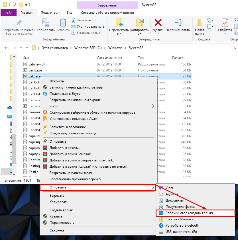 - Щелкните ПКМ по файлу «calc.exe».