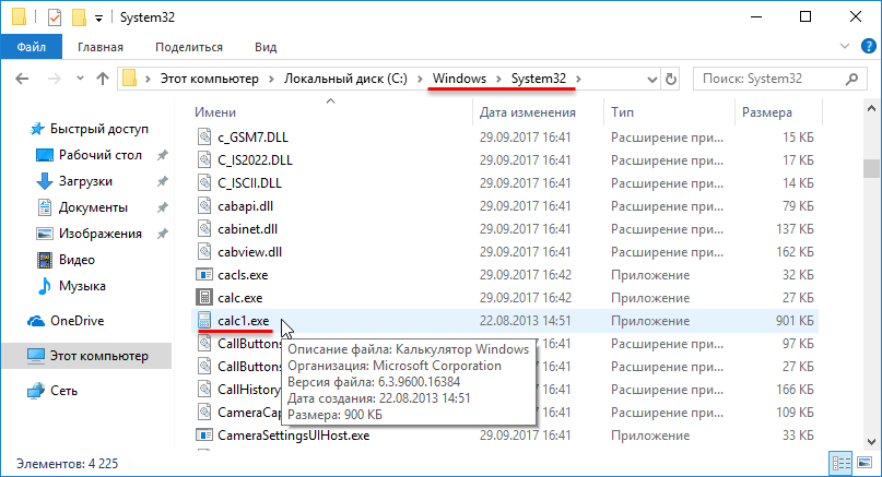 Откройте в Проводнике директорию «C:WindowsSystem32calc.exe».
