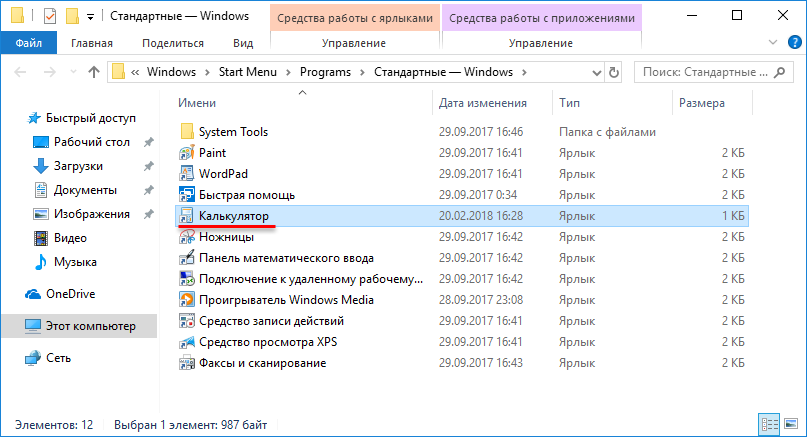Классический калькулятор можно также найти в списке приложений Стандартные — Windows в меню «Пуск».