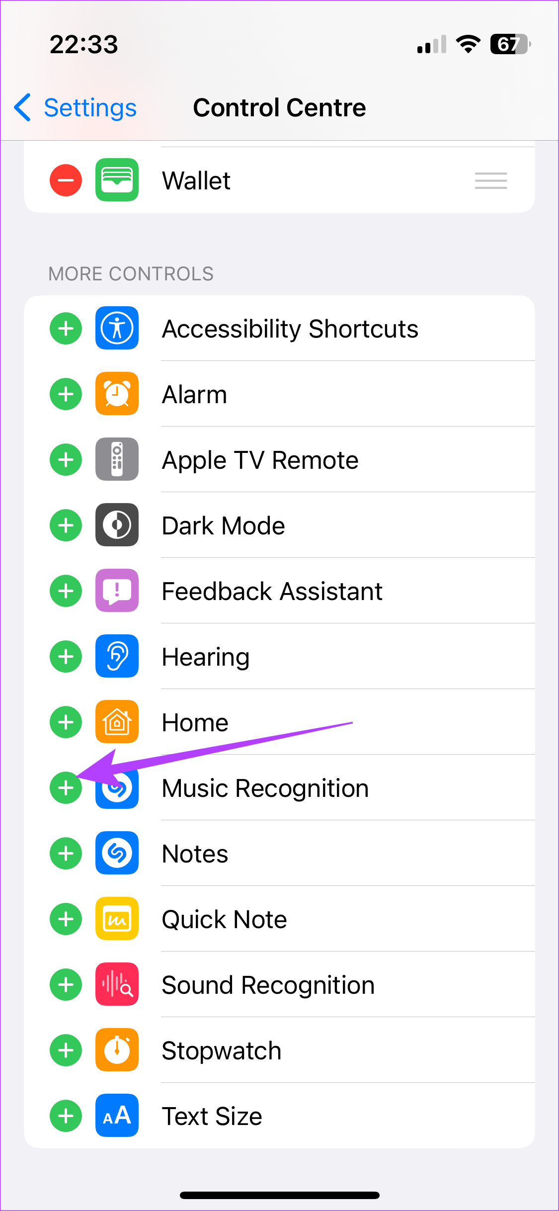 Step 1: Open the Settings app on your iPhone and navigate to the Control Center tab. Scroll down to the More Controls section and spot the Music Recognition option. Press the plus sign next to it to add the toggle to the Control Center.