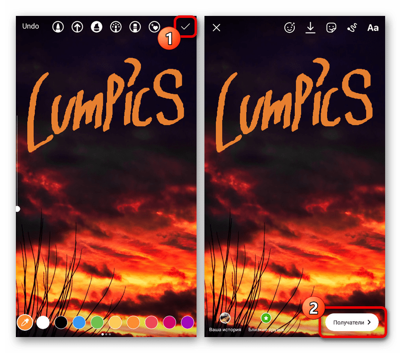 Чтобы сохранить конечный результат, используйте галочку в правом верхнем углу экрана. После этого публикация производится по аналогии с любой сторис, так как текст является всего лишь одним из элементов редактора.
