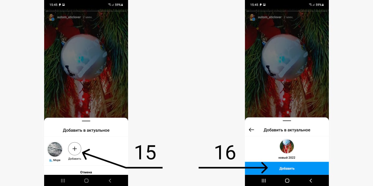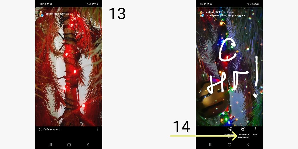 Кнопка добавления в Актуальное находится внизу готовой Истории (14). Кликаем по ней, открывается вкладка с плюсиком в кружочке (15). Нажимая на плюсик, вы создаете новую подборку Актуальных Историй. Не забудьте дать этой подборке название, чтобы потом проще было найти, если у вас будет много таких подборок.