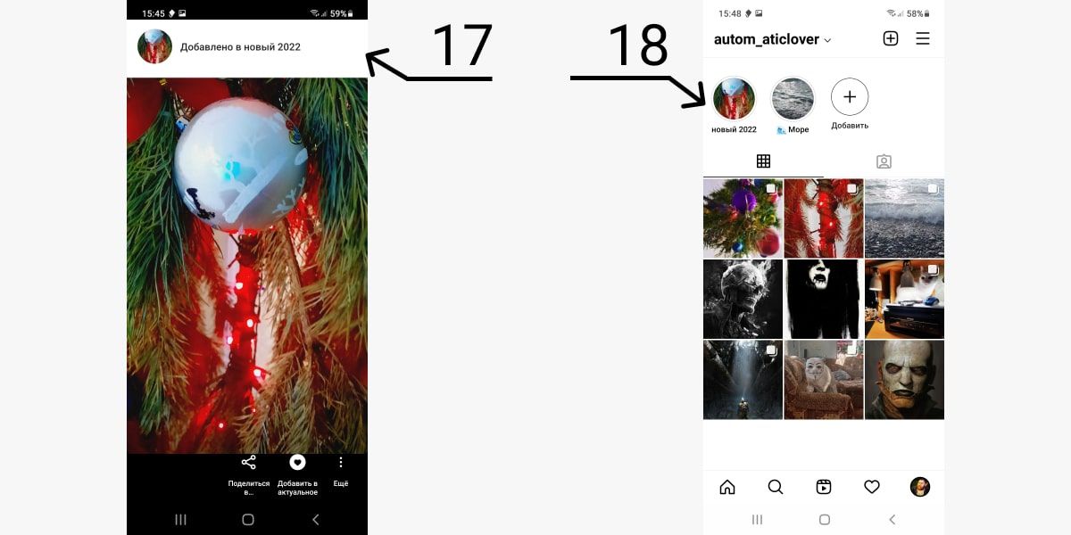 Нажимаем «Добавить» (16), и вот наша История сохранена в новой подборке Актуального (17) – смотрим, любуемся, вспоминаем в любое время.