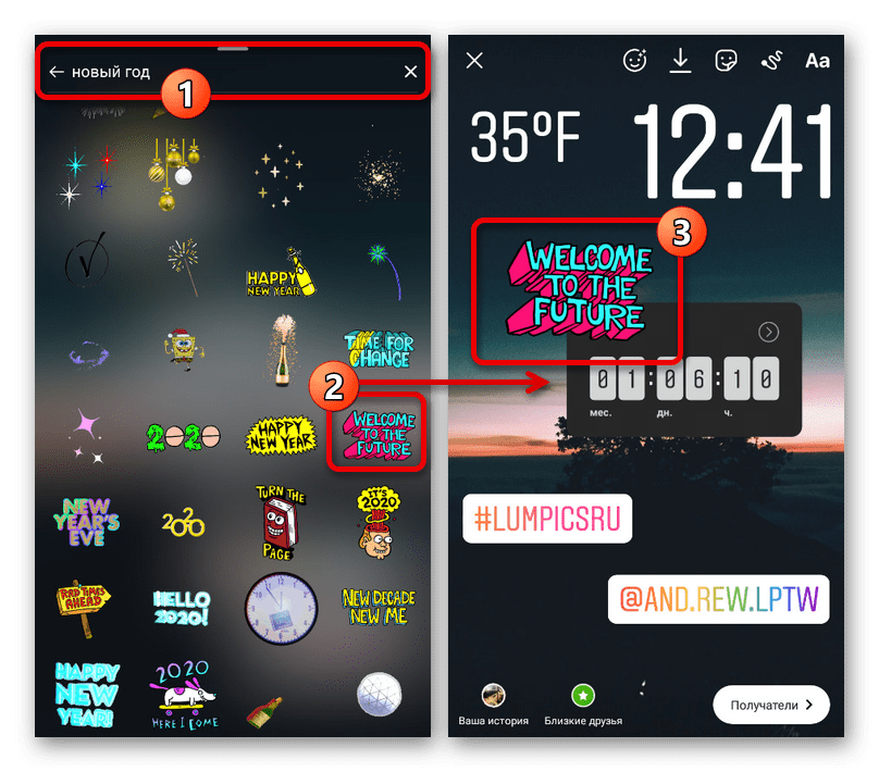 В качестве дополнительного решения можете прибегнуть к поиску в разделе с наклейками, чтобы отыскать конкретную подпись. Как правило, здесь имеются лишь анимированные надписи на английской языке, редактировать которые нельзя.