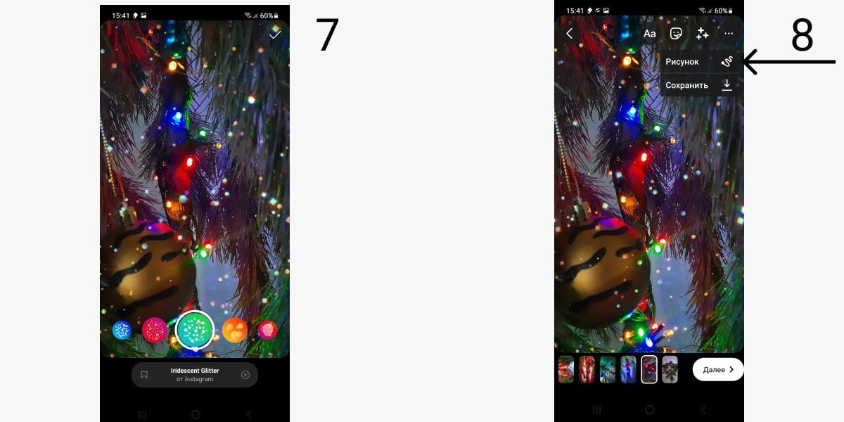 Также вы можете добавить к фото рисунок или надпись, сделанные своей рукой. Кроме того, можно сохранить в галерею то, что уже у вас получилось. Если вам нравится идея с надписью, нажмите на три точки справа от звездочек и выберите «рисунок» (8).