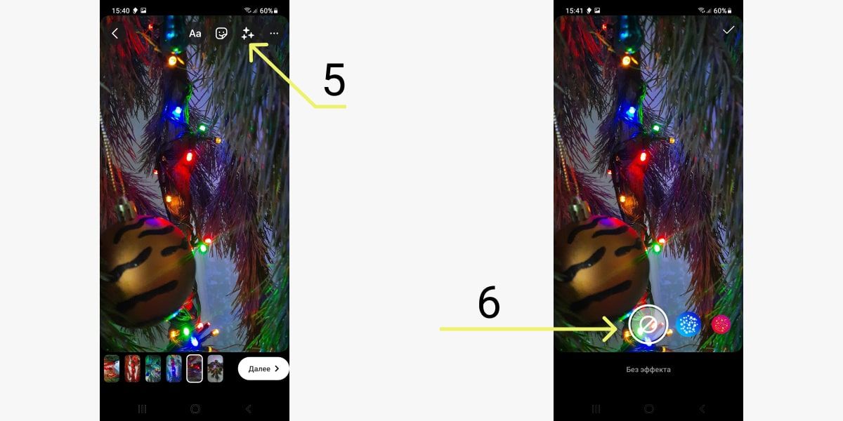 После перехода в меню эффектов вы можете их выбирать. Найдите самые подходящие к вашим сторис эффекты, смахивая влево (6).