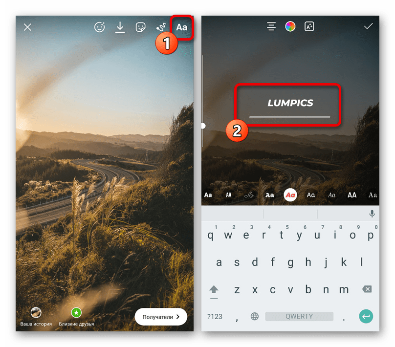 - После перехода к редактору сторис на верхней панели коснитесь кнопки «Аа», чтобы включить инструмент добавления текста. Кроме того, можете просто коснуться любой области на экране.