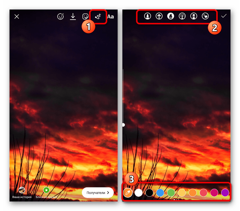 - Для создания текста в истории с помощью инструментов рисования следует подготовить содержимое и коснуться указанной на скриншоте кнопки в редакторе приложения. После этого сразу можете выбрать одну из кистей, установить цвет, а также изменить размер.