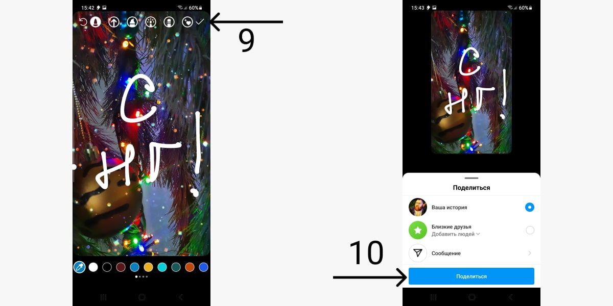 Если рисунок готов, в нашем случае это сокращенное поздравление с Новым годом, нажмите на галочку вверху справа (9). Вы перейдете дальше и сможете поделиться своей готовой Историей (10).