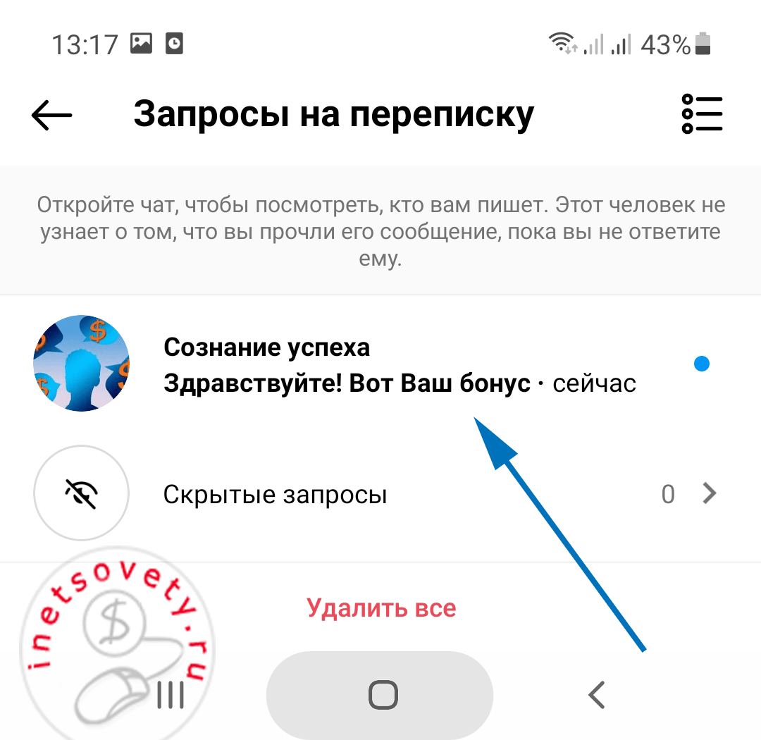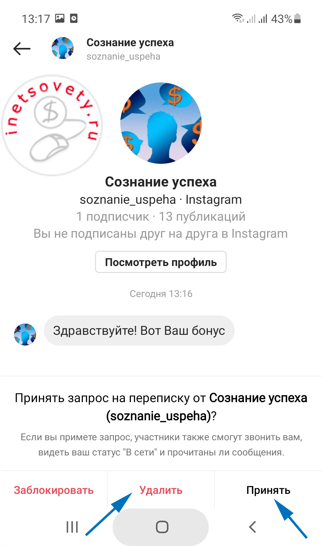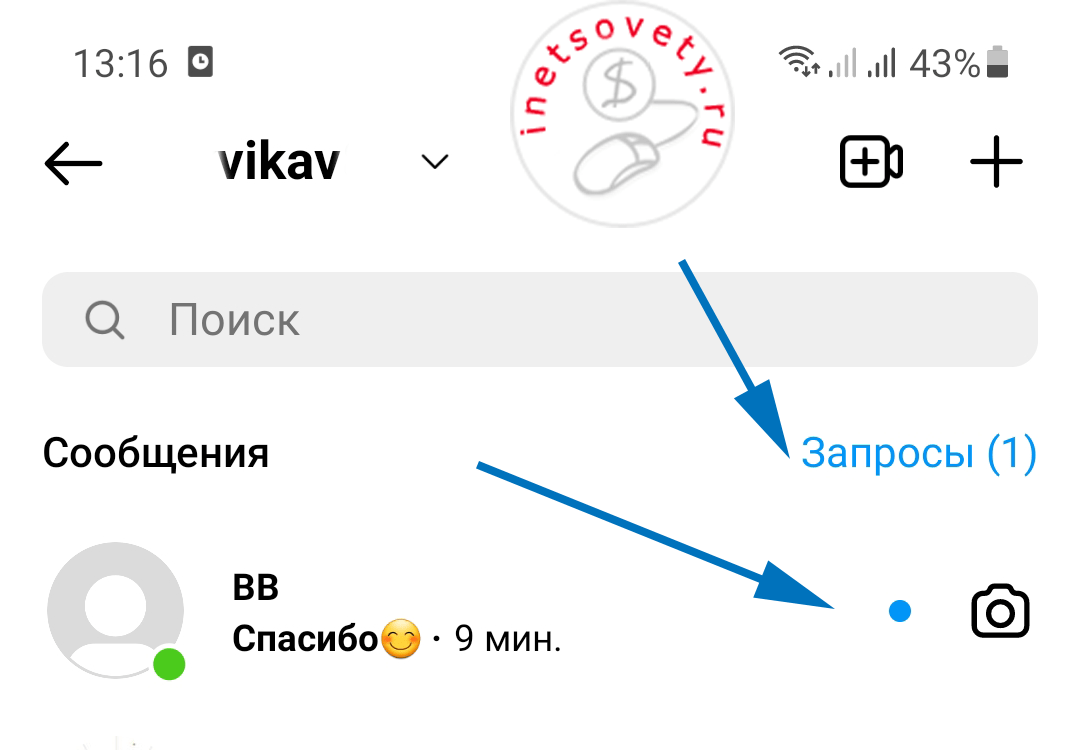 В случае когда СМС отправил пользователь, на которого вы не подписаны, оно отправится в раздел «Запросы». Вы сможете «Принять» или «Отклонить» беседу.