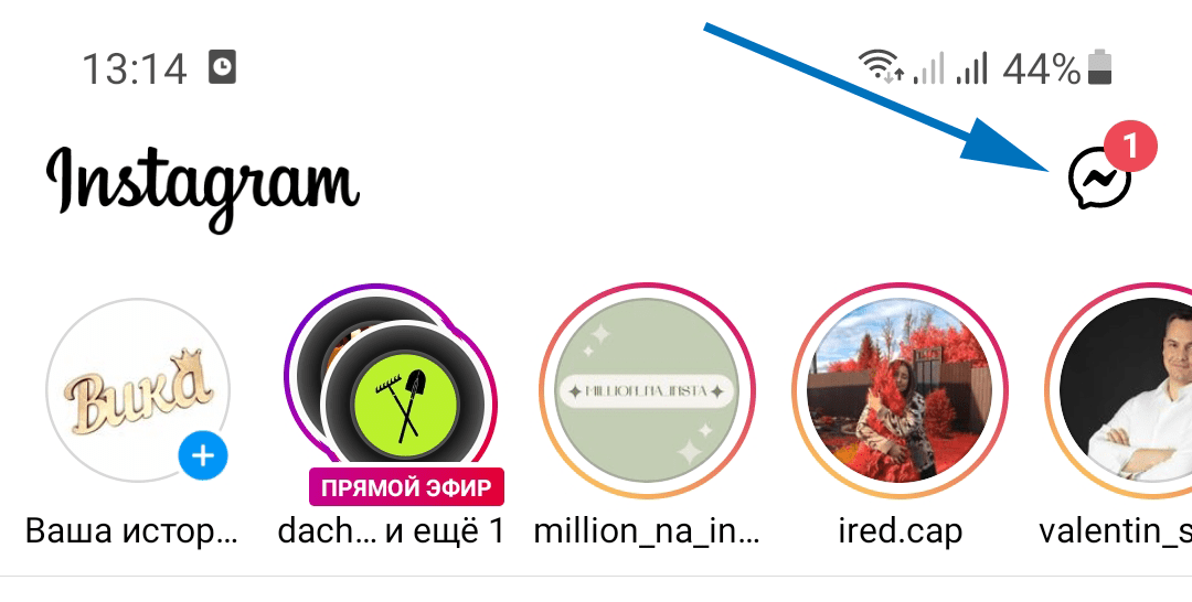- На главном экране загрузки ленты страниц, на которые подписан профиль, нужно найти раздел личных сообщений или Директ. Он отмечен значком в виде самолетика в правом верхнем углу на панели инструментов главного экрана.