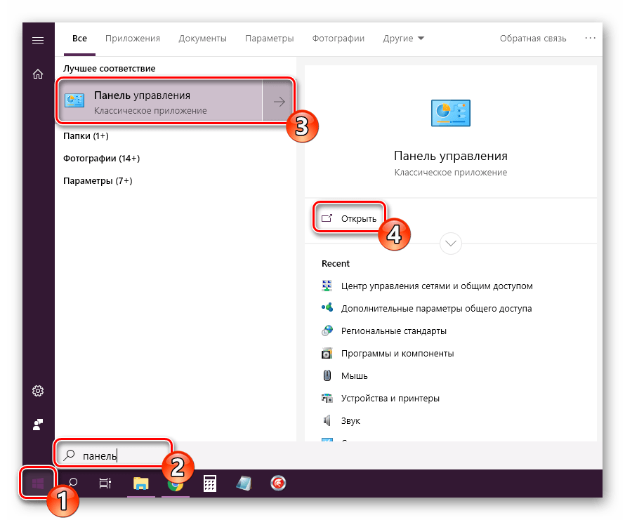 - Откройте «Панель управления» через меню «Пуск».