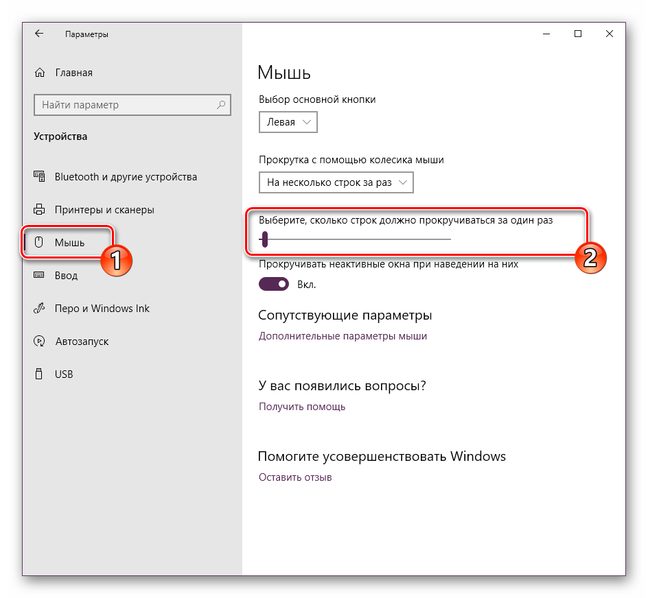 Также это можно сделать с помощью раздела Параметры. В блоке «Устройства» следует перейти к пункту «Мышь». Здесь будет предложено выбрать, что будет пролистываться – строки или страницы. Выбрав первый вариант, понадобится задать количество строчек, которые будут прокручиваться за один скролл.