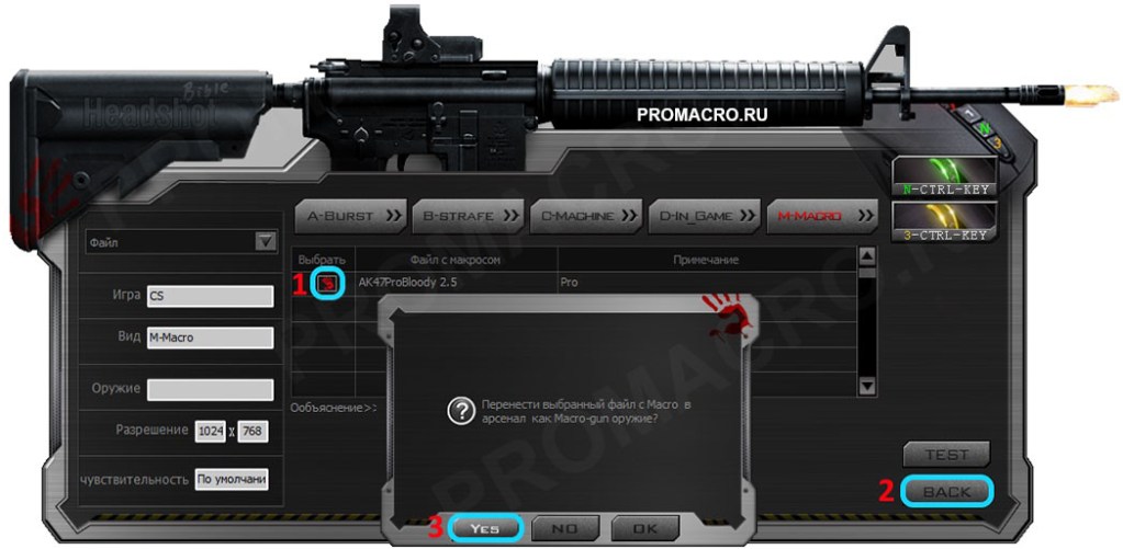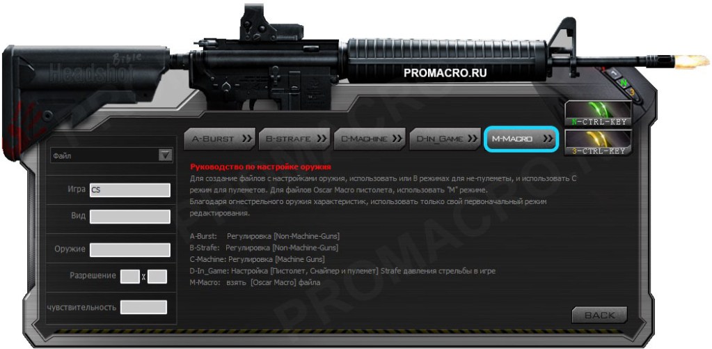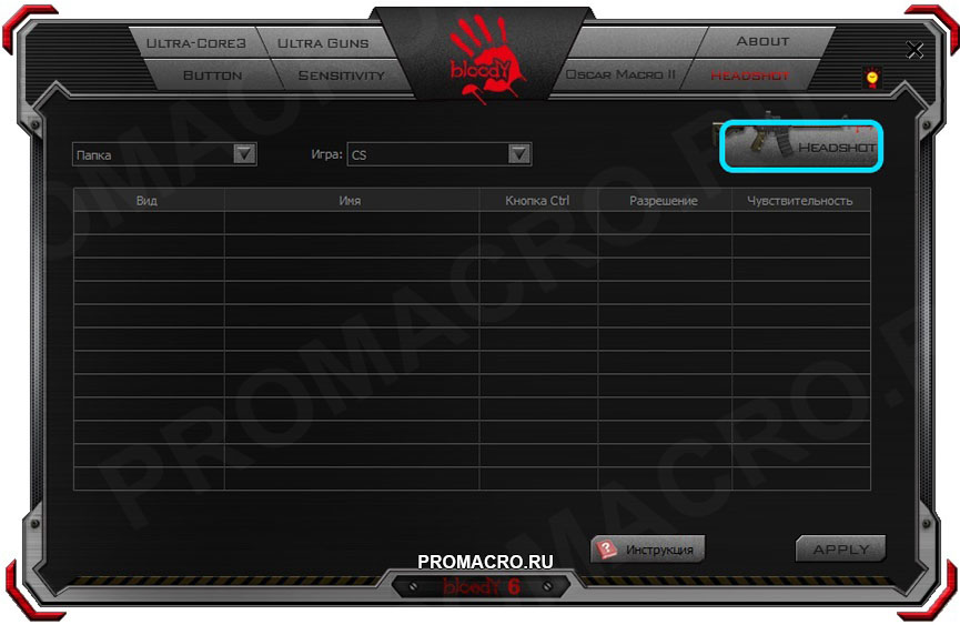 Теперь макрос скопирован в папку с программой и осталось загрузить его в мышь. Для этого переходим в раздел HEADSHOT.