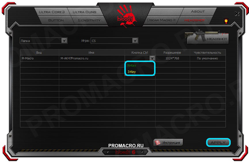Выбираете кнопку активации макроса (N-Key или 3-Key) и нажимаете APPLY