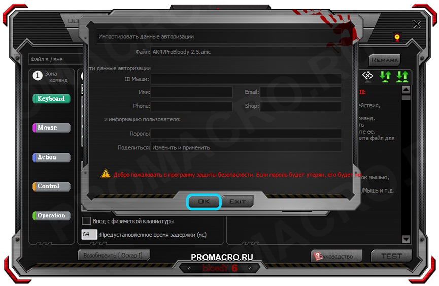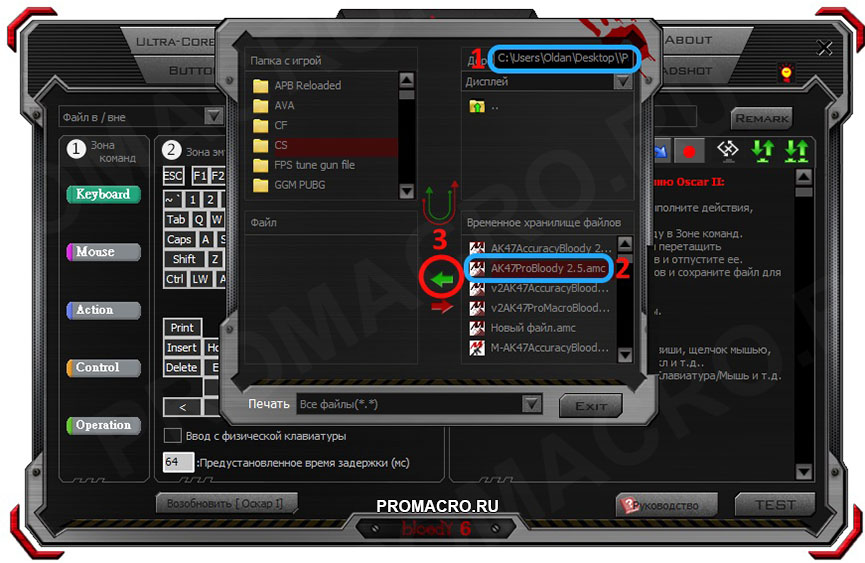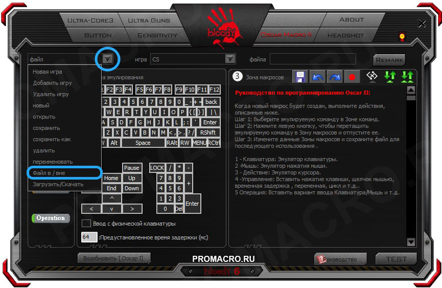 Открываем программу Bloody, затем открываем меню Oscar Macro II и переходим во вкладку файл – Файл в/вне.