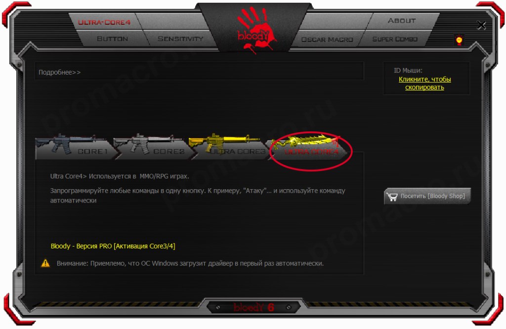 Что бы пользоваться макросами у вас должна быть мышка с активированной системой Ultra core3/4. У нас есть отдельная статья о том, как активировать Core3/4 в мышках A4Tech Bloody.