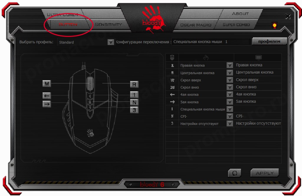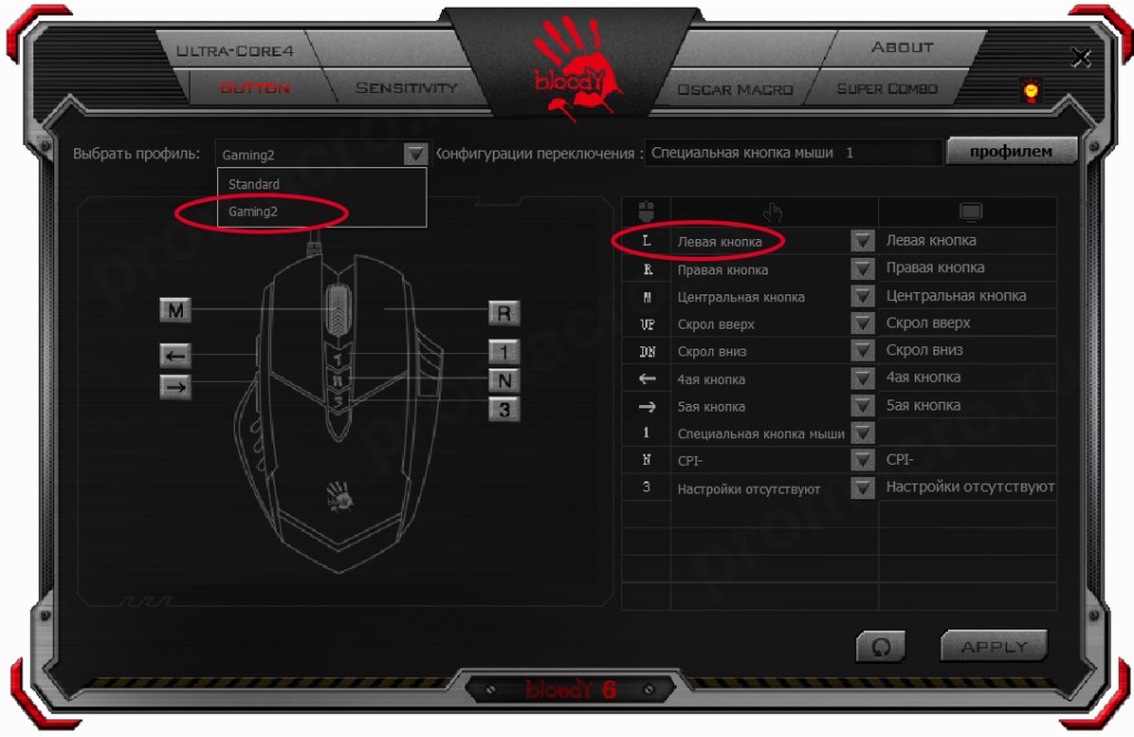 Меняем профиль Standard на любой другой начинающийся с Gaming, после чего, среди кнопок мыши доступных в программе Bloody появится левая кнопка мыши.