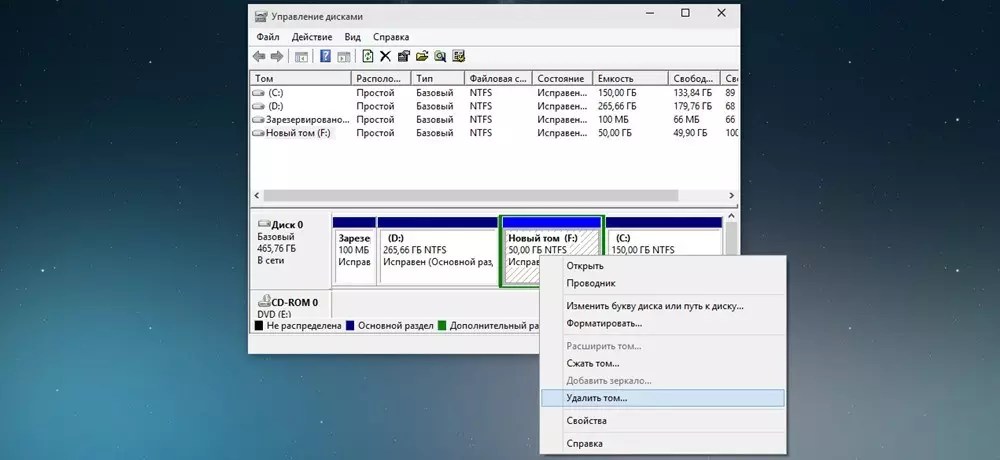 Удалите второй раздел, нажав на него правой кнопкой мыши и выбрав пункт «Удалить том». Не забывайте, что при этом потеряете все хранящиеся на нём файлы!
