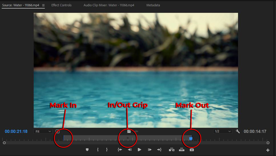 Переместите курсор в начало первого клипа и отметьте с помощью сочетания клавиш. я или перейдя в Маркеры> Mark In. Используйте стрелку вниз, чтобы перейти к концу клипа, а затем Отметить используя сочетание клавиш О или собирается Маркеры> Выделить. Теперь вы должны увидеть, что один клип выделен.