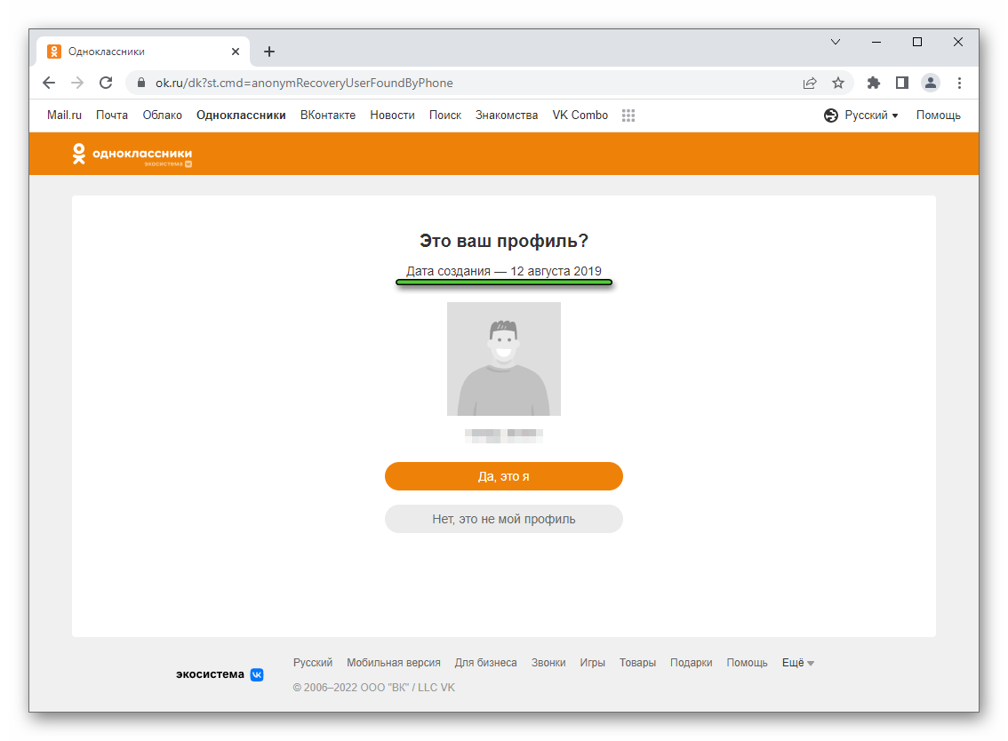 Под вопросом «Это ваш профиль?» вы увидите дату его создания. На этом поставленную задачу можно считать успешно решенной.