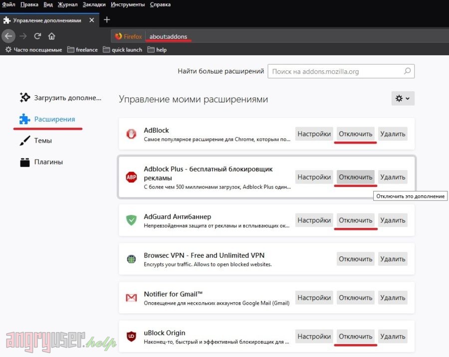 Чтобы полностью отключить сторонние блокировщики рекламы в Firefox, откройте меню расширений браузера. Для этого введите «about:addons» в адресную строку. Далее нажмите отключить рядом с теми расширениями, работу которых необходимо остановить.