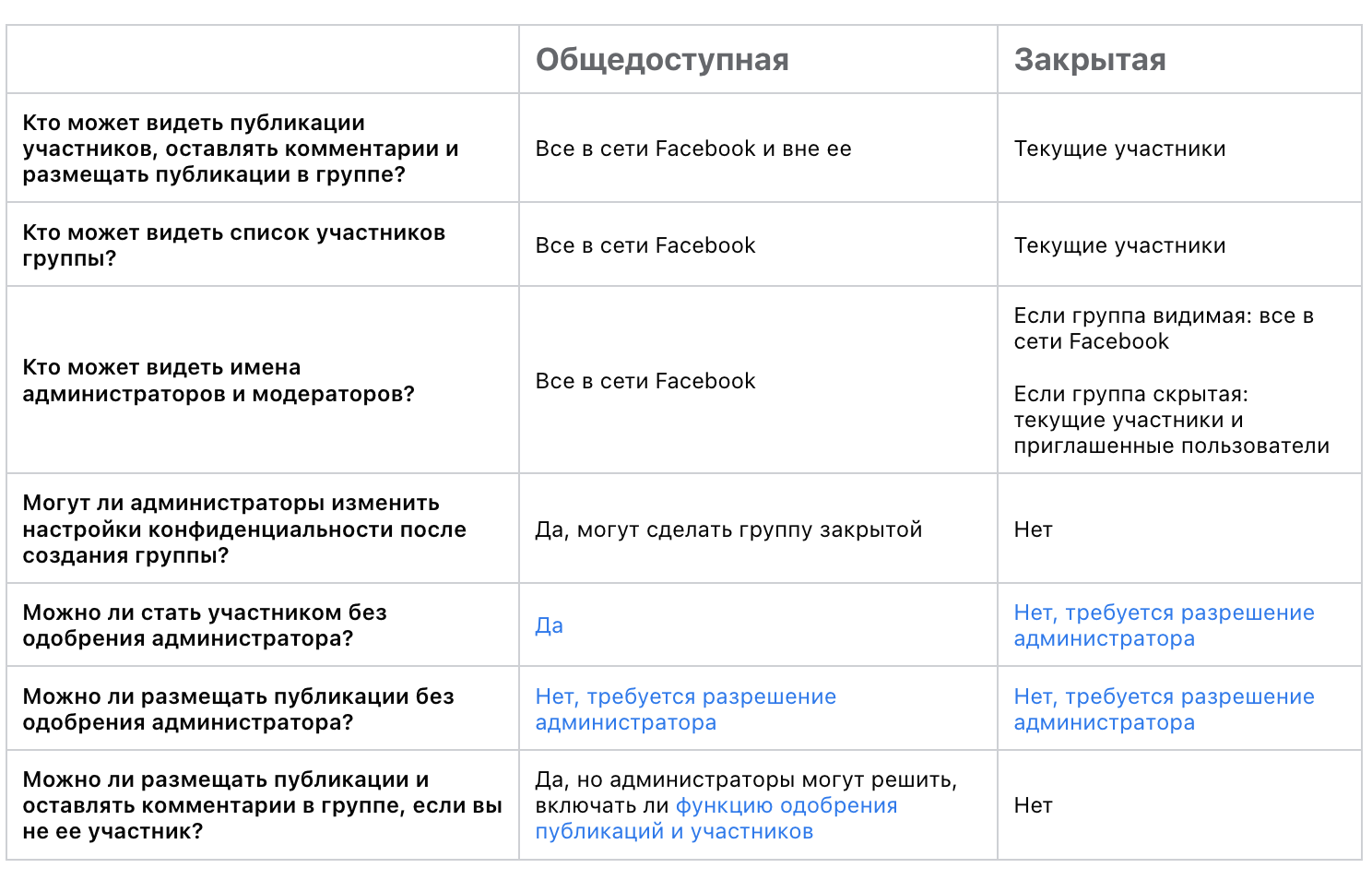 При создании группы вы можете выбрать одну из двух опций в настройках конфиденциальности группы: общедоступная или закрытая. Эта таблица от Facebook демонстрирует различия в настройках: