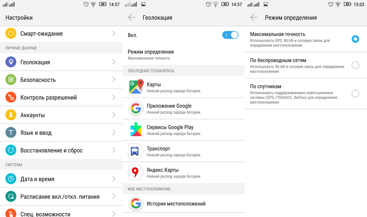 (может варьироваться в зависимости от модели) и зайдите в него. В самом верху вы увидите ползун, позволяющий включать и выключать функцию геолокации, а также режим определения, выбор которого будет зависеть от того, насколько вы готовы садить заряд батареи своего мобильного устройства.
