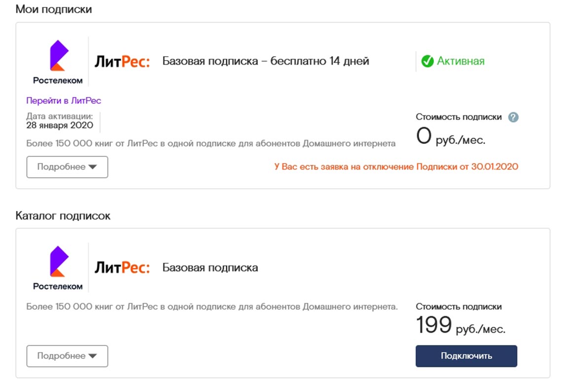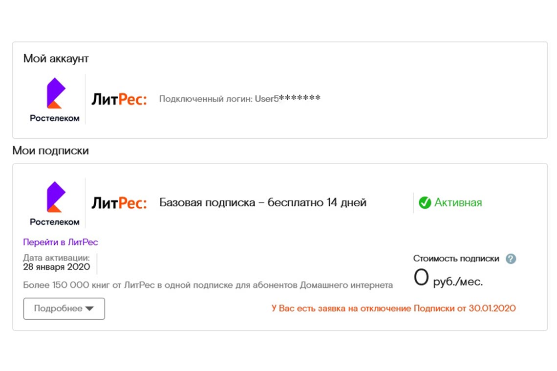 Как через ЕЛК отключить подписку на Литрес от Ростелекома