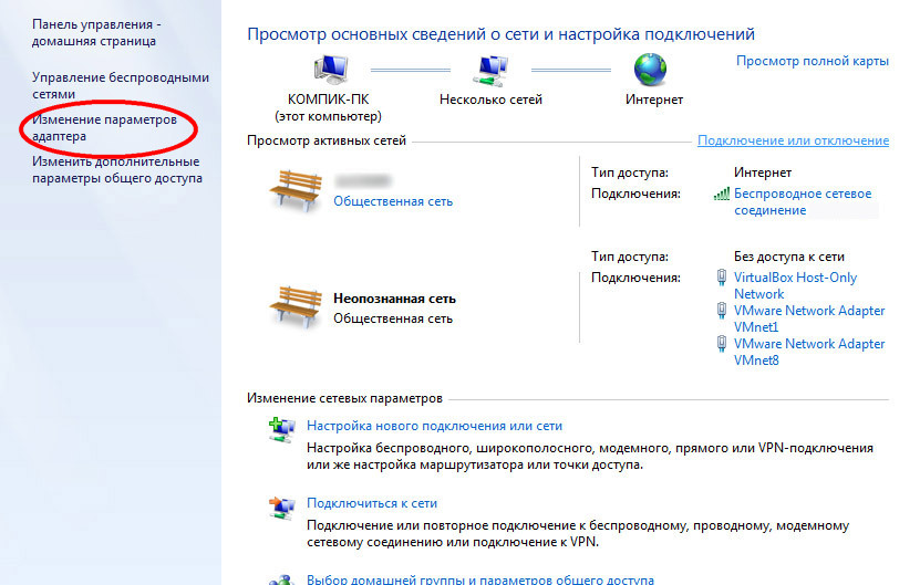 2. В открывшемся окне нажмите на вкладку “Изменение параметров адаптера”.