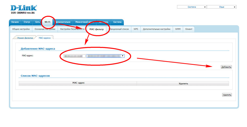 Установите режим доступа «Запретить указанный». Введите желаемый MAC-адрес в поле ниже и добавьте его в список.