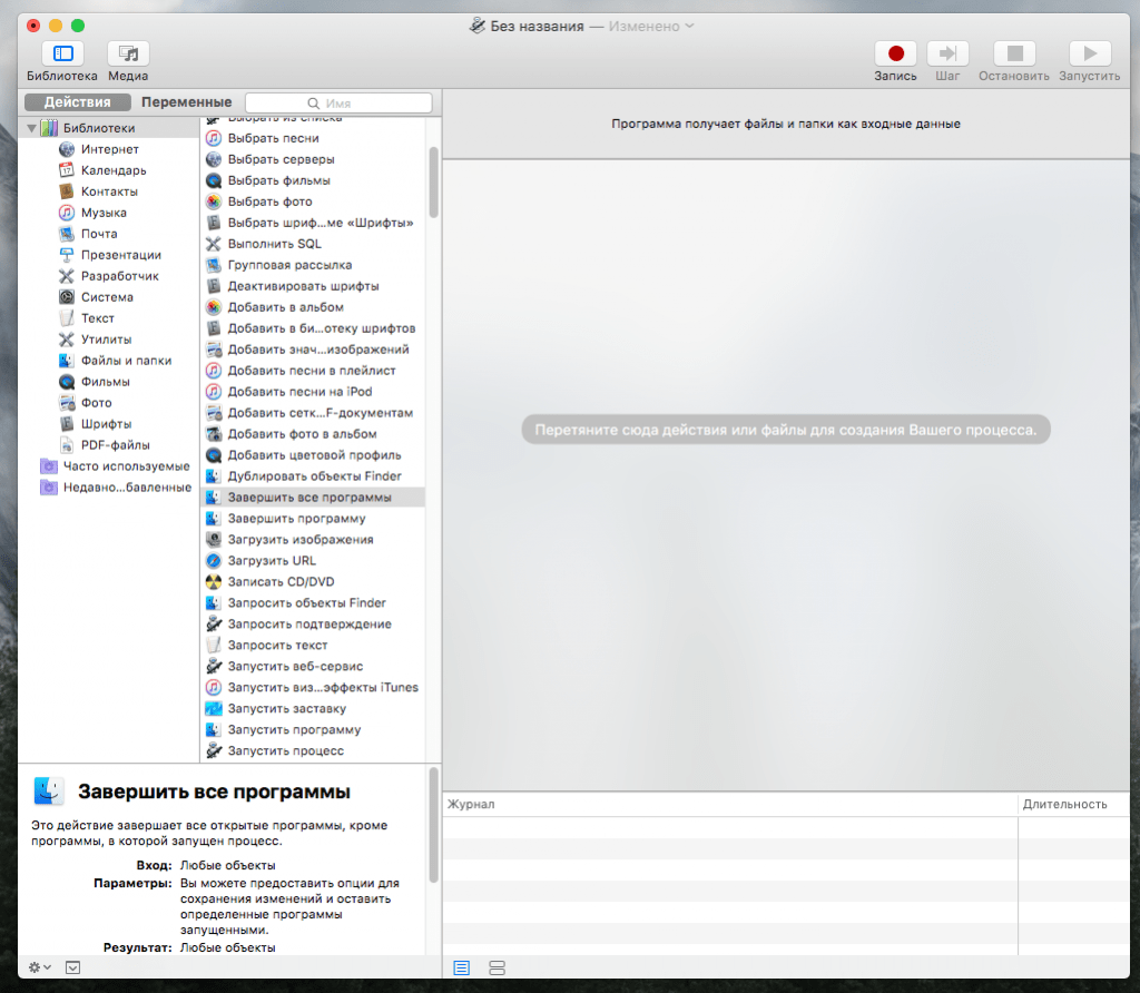 . Quit All Applications загрузит команду в рабочее поле. Здесь появится возможность добавить приложения, которое с помощью нового апплета закрывать не нужно.