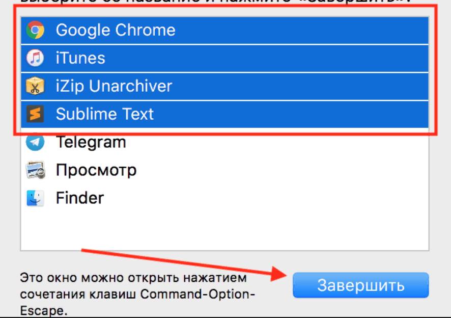 Выделите нажатием по трекпаду или кликом мышки программу, которую требуется закрыть, и воспользуйтесь кнопкой «Завершить».