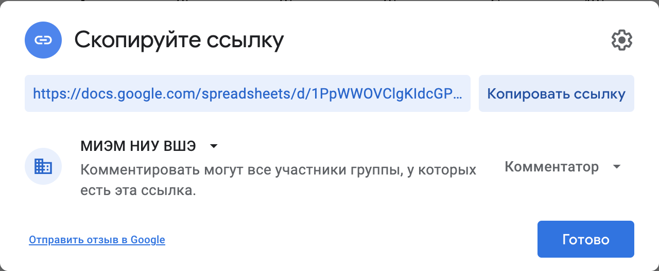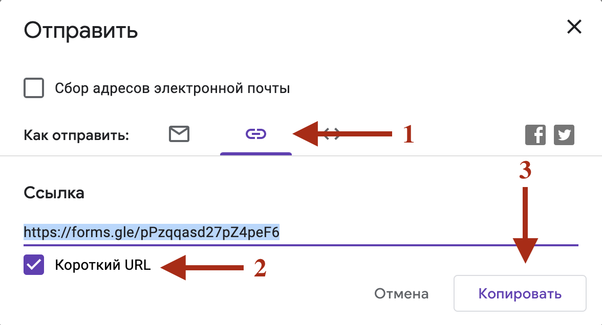 Для получения такой ссылки нужно нажать на кнопку «Отправить» справа вверху. Открывается окно настройки отправки, в котором нужно нажать на значок ссылки. При этом откроется следующее окно, в котором вы увидите ссылку на свою форму.