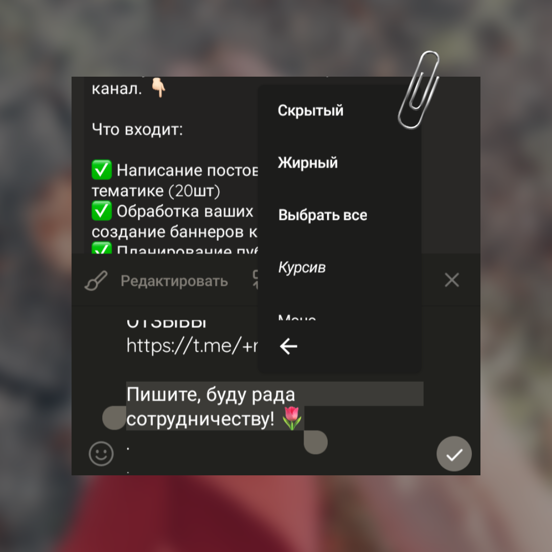 Еще вы можете редактировать текст внутри поста. Это можно сделать только после публикации. Нажмите на Опубликованный пост > редактировать. Выберите фрагмент текста и нажмите на три точки, появится несколько вариантов: можно сделать шрифт жирным, курсивным, подчёркнутым, скрытым, добавить к тексту ссылку и т. д.