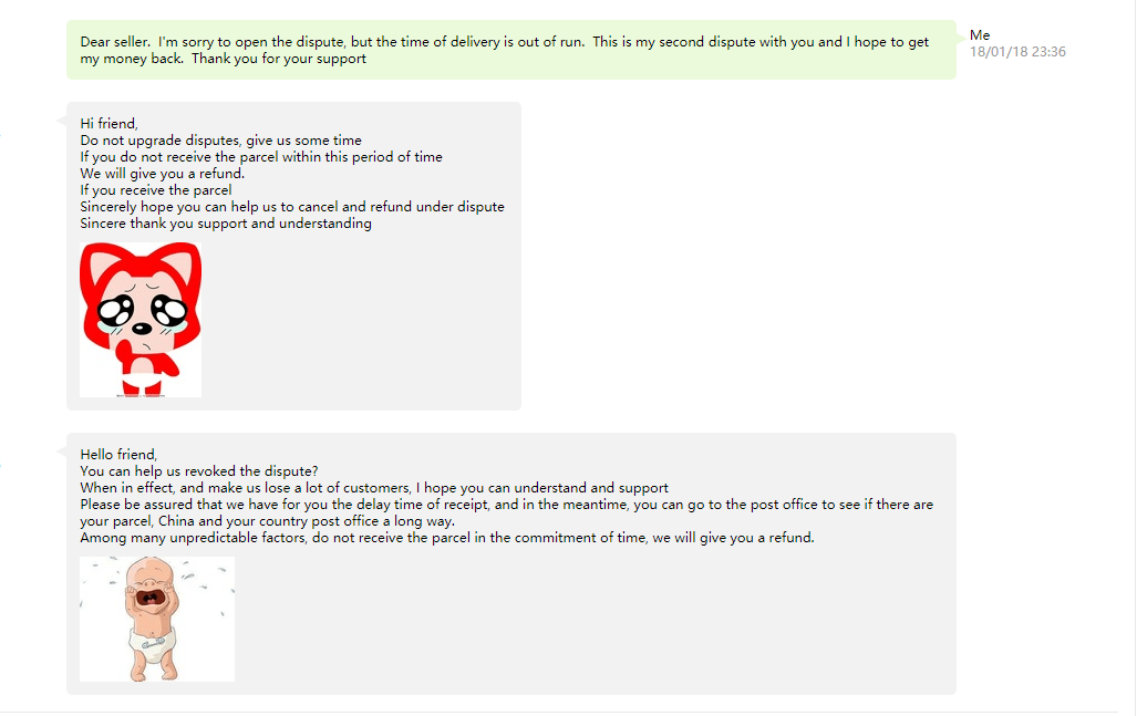 Если вы пустили слезу, после жалостливого рассказа продавца о его тяжелой судьбе и уже подумываете об отмене спора, еще раз подумайте, а так ли вы хорошо живете, что бы по сути просто подарить китайцу N-ую сумму денег. К тому же если вы открывали спор в последние дни истечения срока Защиты покупателя, открыть спор повторно будет уже невозможно.