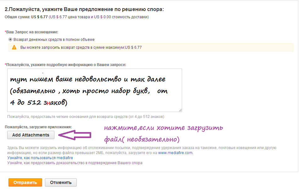 10. Важный этап — прикрепляем доказательства, которые смогут убедить продавца и Алиэкспресс в том, что требование о возврате средств обоснованное.