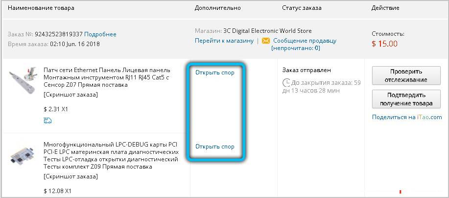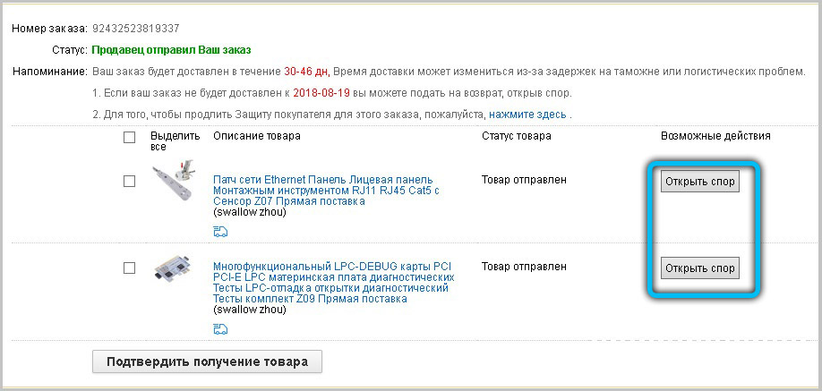 - Подтвердить получение> и открыть спор (диспут), нажав на кнопки «Подтвердить получение товара» и «Открыть спор» в деталях заказа.